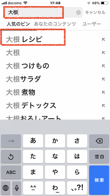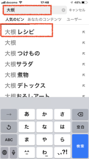 上部の【キーワード検索】ボックスにキーワードを入力して、画像や動画を探すことができます。例えば、『大根』を入力して表示される一覧から『大根レシピ』をタップします。