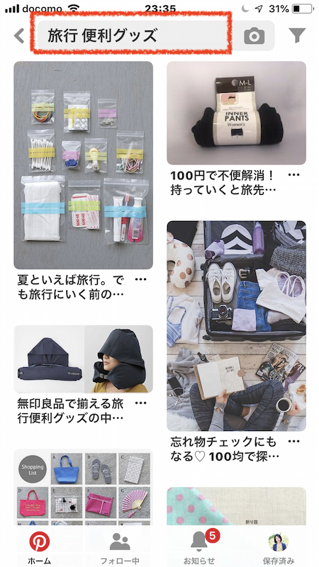 他にも思いついたキーワードで検索をすると楽しいですよ。例えば、『旅行 便利グッズ』というキーワードで検索すると↓が表示されます。