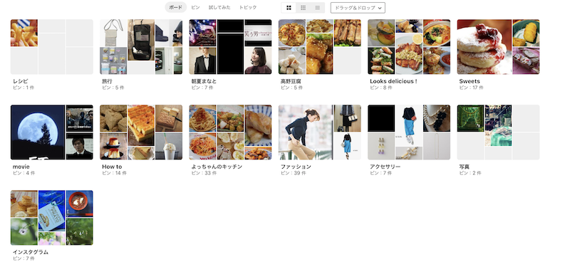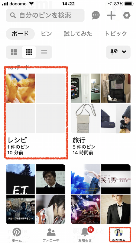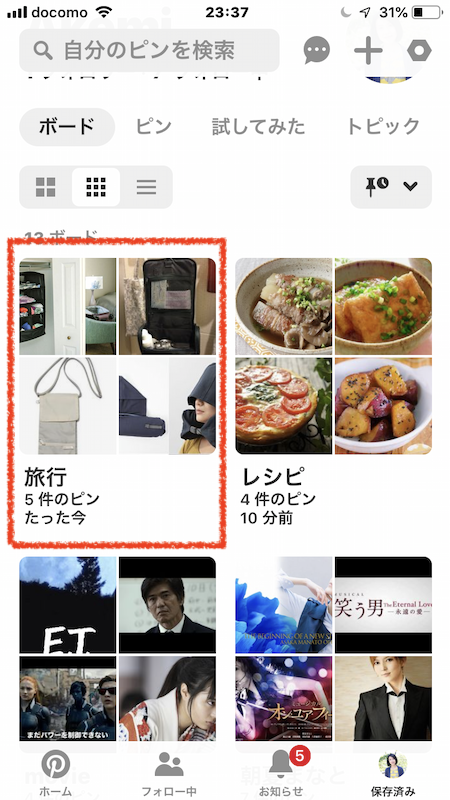 『旅行』というボードを作成して、興味のあるものを保存しました。