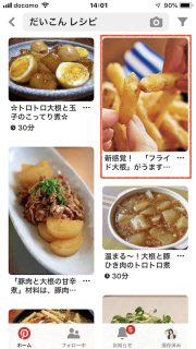 画面右下の【保存済み】をタップすると、自分のスペースに『レシピ』というボードを作成されて、その中に(フライド大根)レシピが保存されています。
