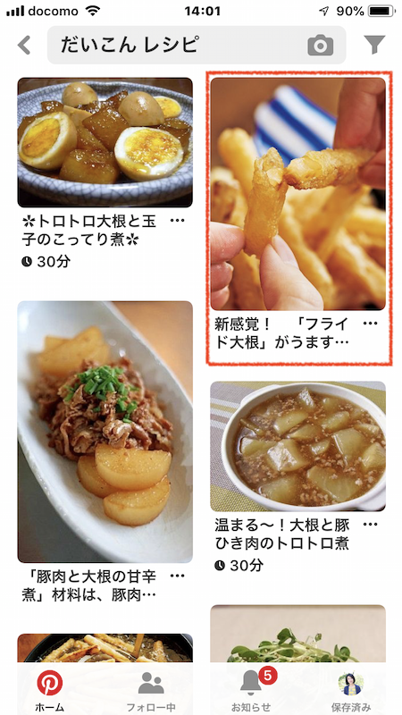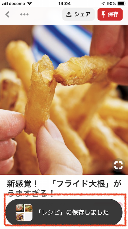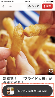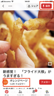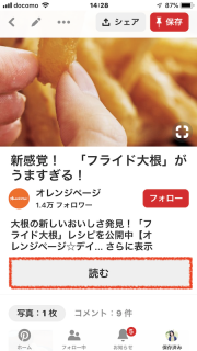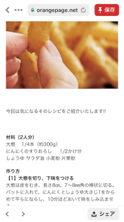 これはオレンジページのレシピですね。「フライド大根、気になるわ!」と思ったら右上の【保存】をタップします。←これがpinすることです!