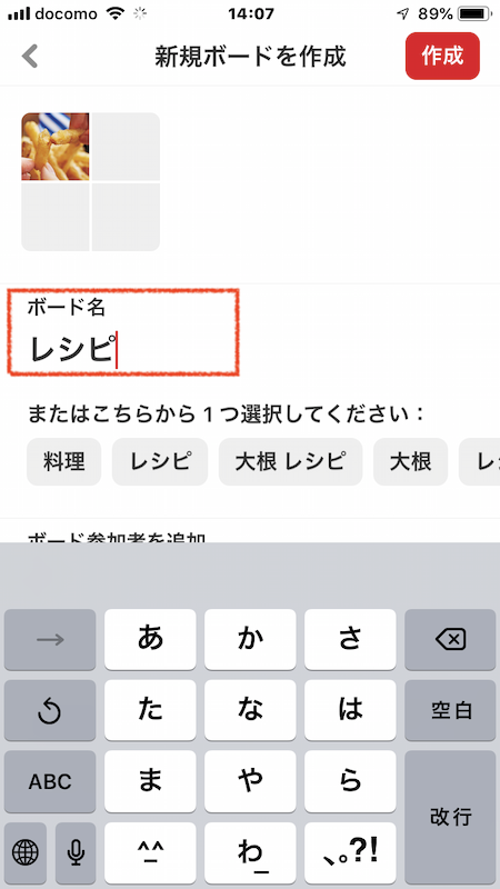 ボード名を入力します。ここでは『レシピ』などわかりやすい名前をつけるといいですね。【作成】をタップします。