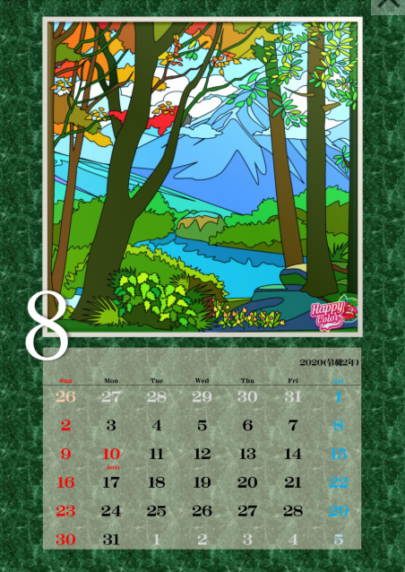 「楽しんだ塗り絵作品をカレンダーにしました。濃い緑の背景がピタッとハマってよかった!」