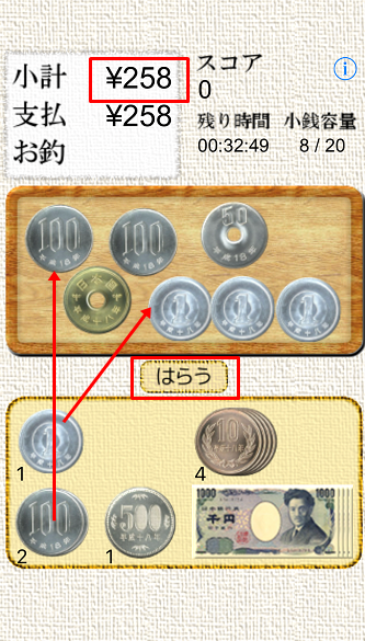 下段のコインを上段にドラッグし<はらう>をタップしましょう