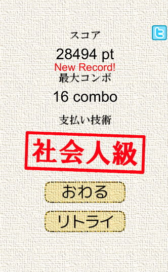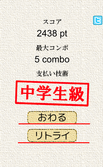 再挑戦するには<リトライ>、ゲームを終了するには<おわる>をタップします