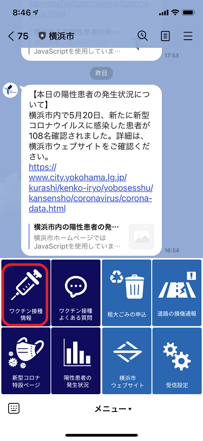 ② 【ワクチン接種情報】をタップして、画面を下に下げます。