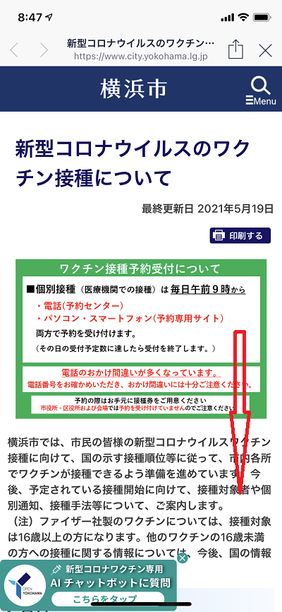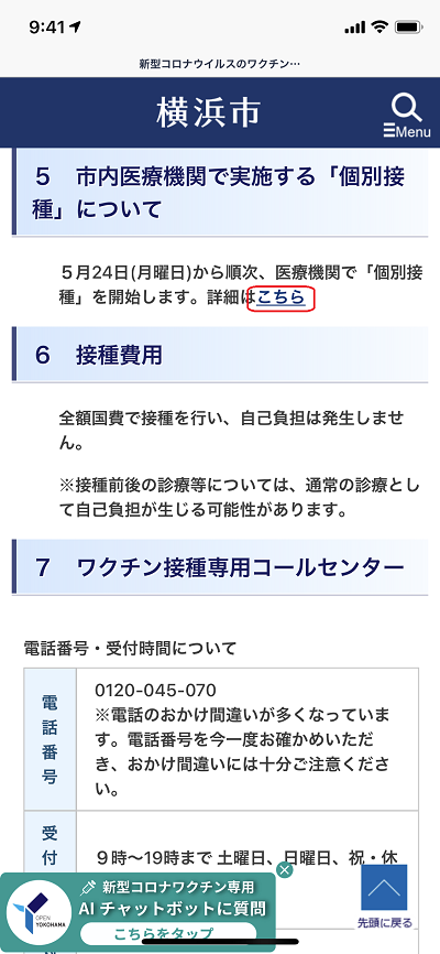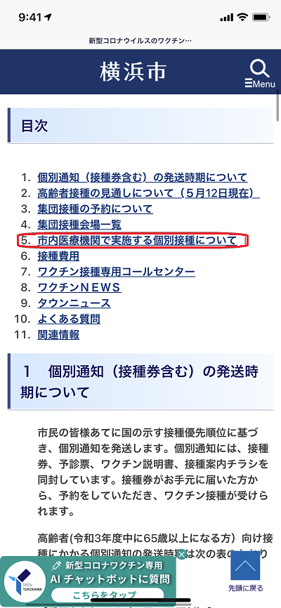 ④ 「5 市内医療機関で実施する「個別接種」について」の「こちら」をタップします。