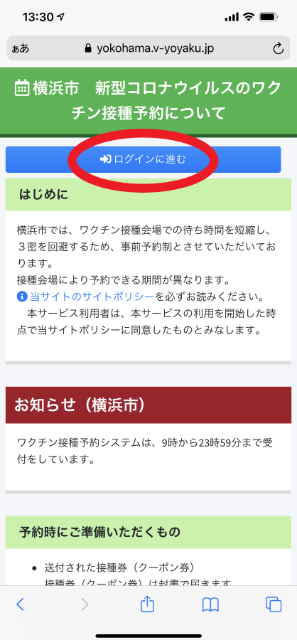 接種券が届いたら、まずは案内文書のQRコードまたはURLから予約サイトを開きます。「ログインに進む」をタップします。