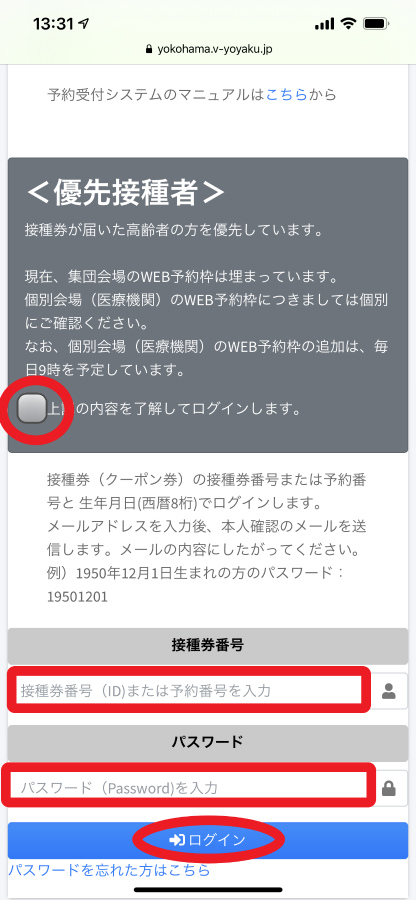 この時、上部の<優先接種者>の欄の「上記の内容を了解してログインします」のチェックボックスをチェックしないとログインする事が出来ませんのでご注意を!