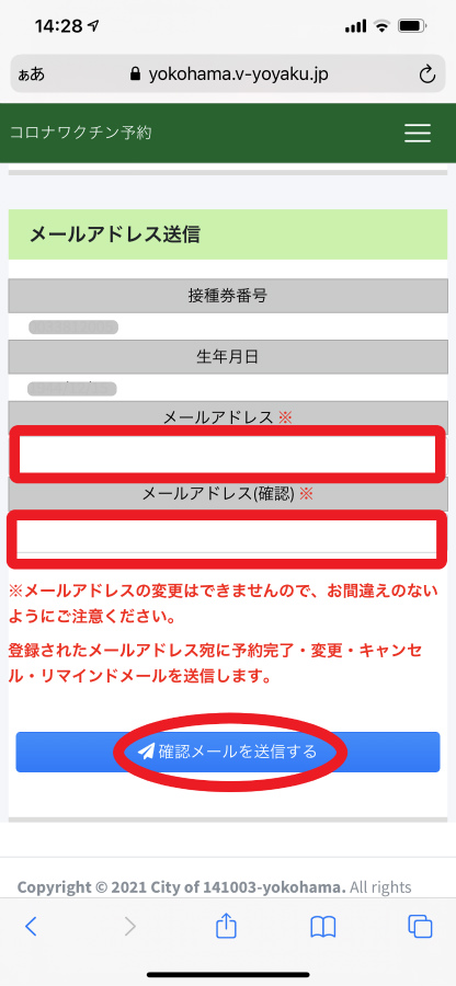 初めての方は、接種券番号と生年月日を確認し、メールアドレスを2回入力します。メールアドレスは後から変更できないので、きちんと受信できるものを登録してくださいね。