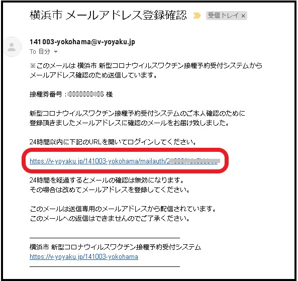 下記のようなメールが登録のアドレスに届きます。赤枠で示したURLをクリックしてください。再度ログイン画面が開きます。