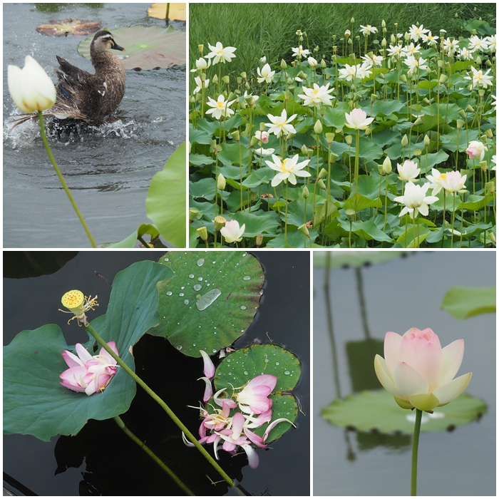 梅雨の晴れ間の日、白やピンクの蓮の花が綺麗に咲いていました。