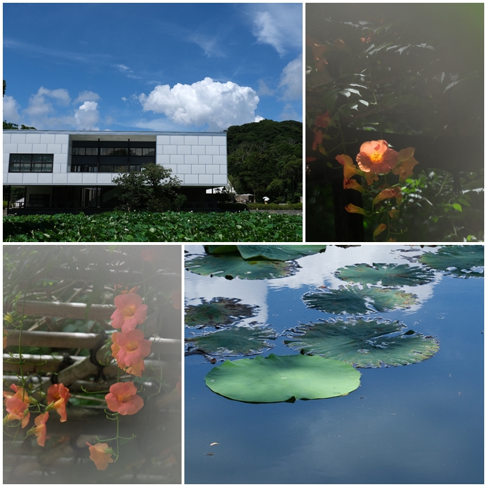 夏の花の本覚寺の蓮、妙本寺のノウゼンカズラ、八幡様の鳥居と青空に夏雲など、