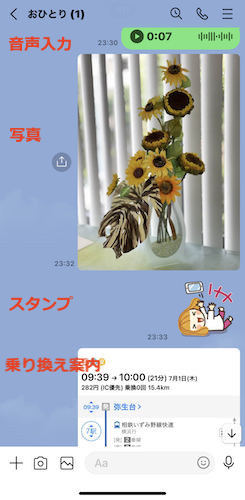 そこでは、覚書やメモを書いたり、スタンプを試してみたり、乗り換え案内のスクショを保存したり、音声入力の練習をしたり・・といった感じで使用することができます。