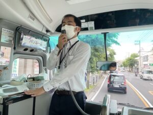 - 運転手は、横バス観光のシゲタさん(運転席)。