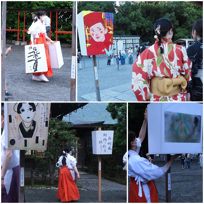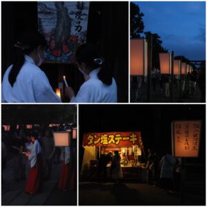 その日は夕立があり、巫女さんがぼんぼりをしまったり、雨が上がれば、又ぼんぼりを出したり、大忙しでした。