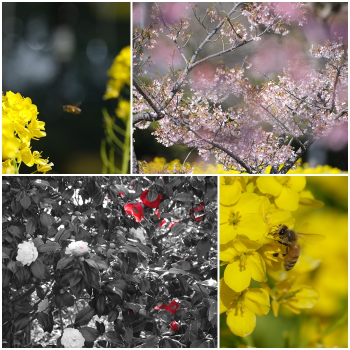 ミツマタや水仙も青空に映え、また菜の花に蜜を求めてハチもいました。