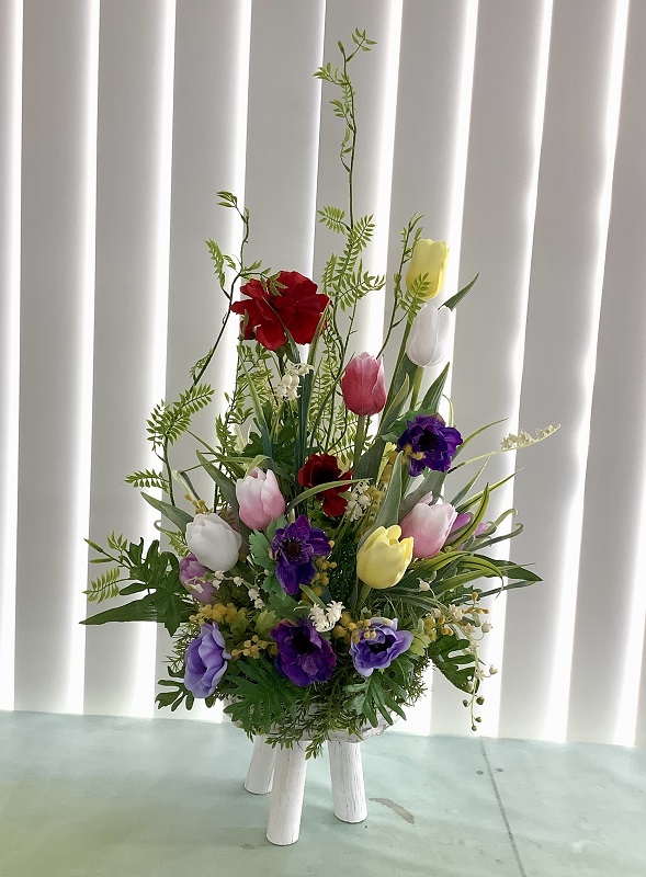 この素敵なフラワーアレンジメントは水彩クラスの熊谷好子さんの作品です。