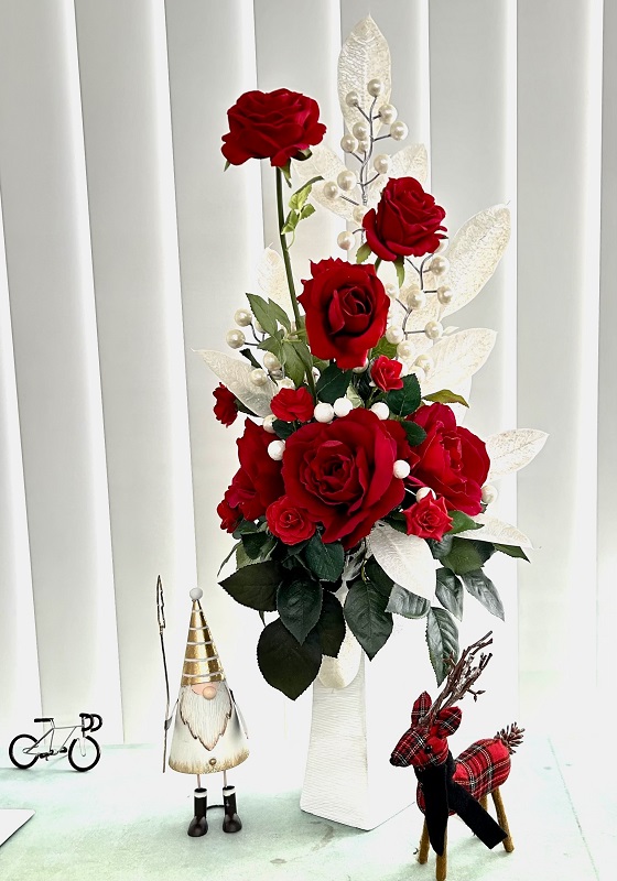 弥生台教室の窓際のディスプレーコーナーにはひと足早くサンタさんがトナカイを連れて真赤な薔薇の花と大粒なパールをあしらったクリスマスバージョンのフラワーアレンジメントを運んでやってきました。