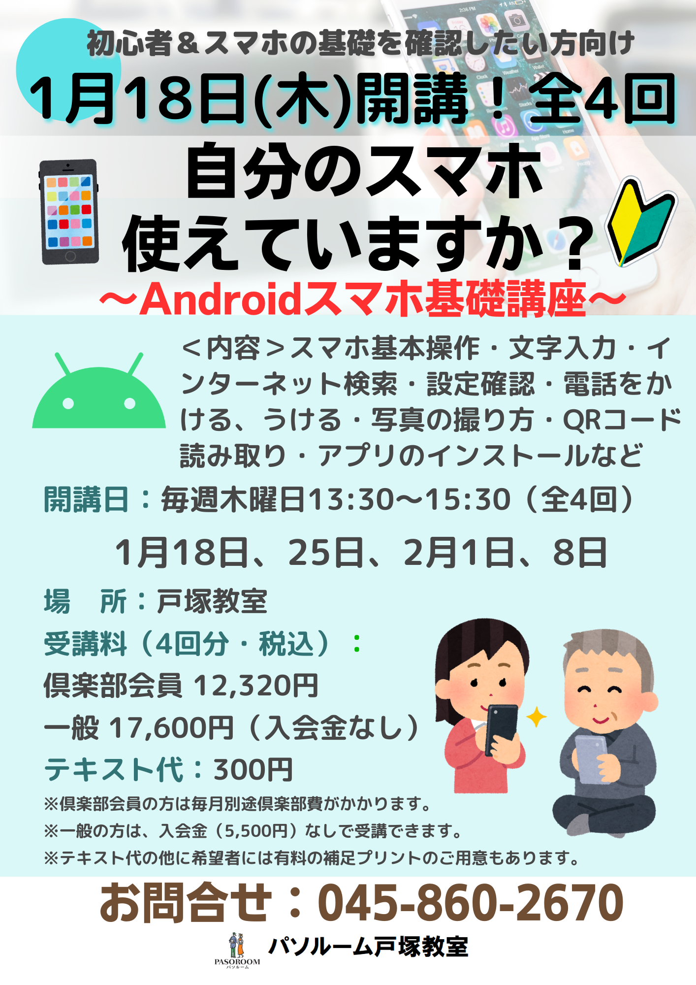 4回の講座は、入会金なし・受講初回に現金で受講料支払いがOKですので、初めて教室を利用される方、Androidスマホの基礎だけ勉強したいという方も大歓迎です。