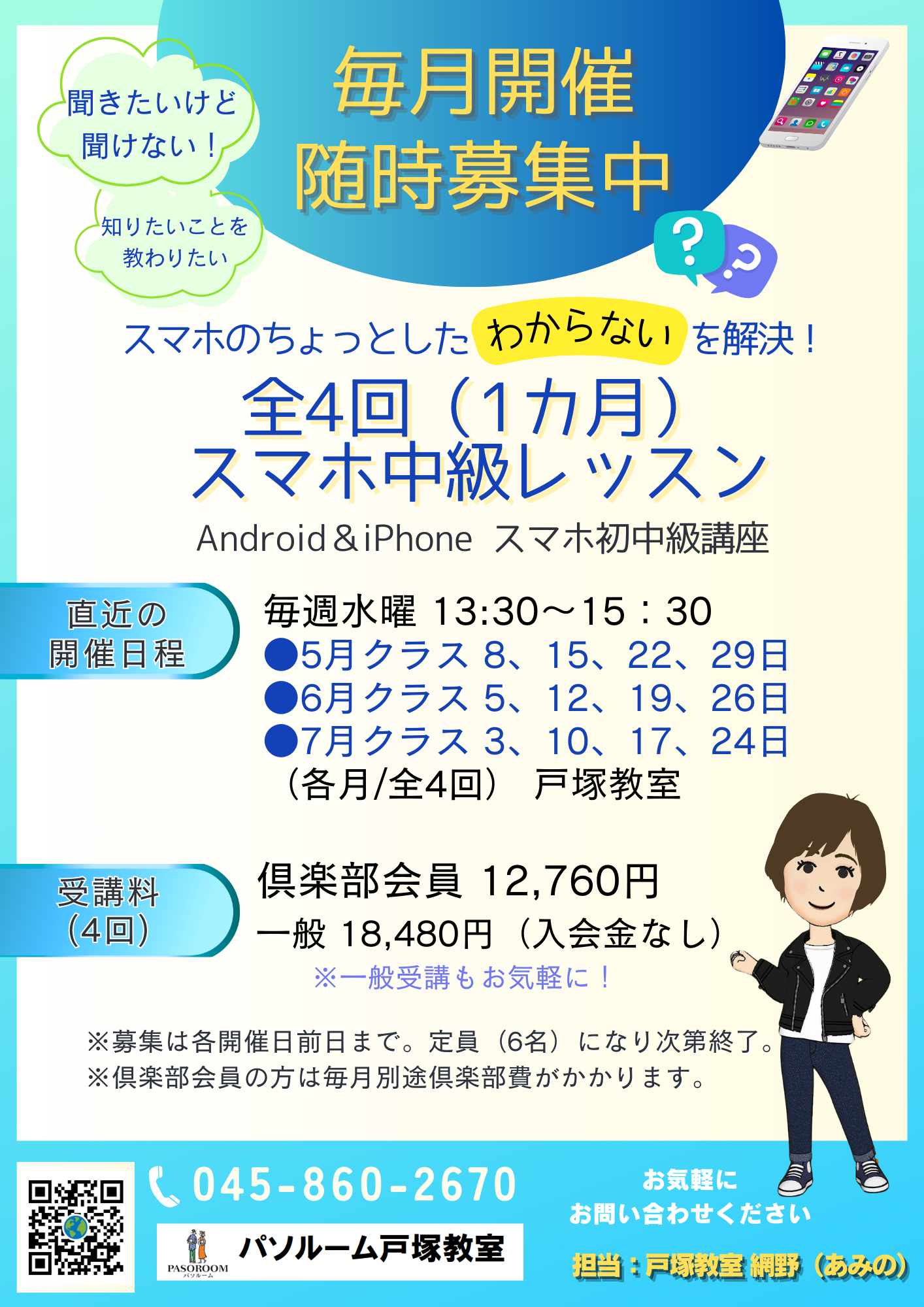 【毎月開講】スマホ短期レッスン(4回)5・6・7月クラス募集中!
