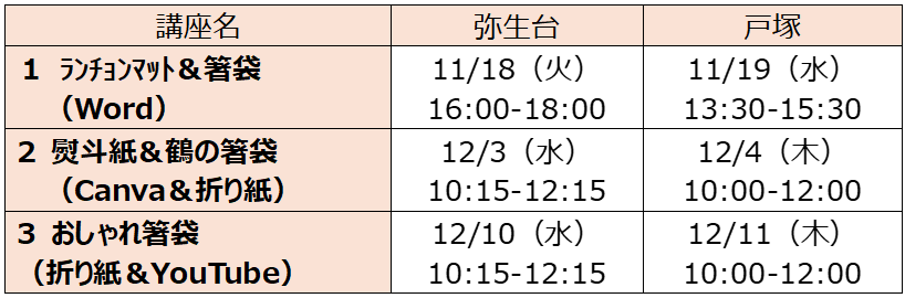 第1弾【ランチョンマット&箸袋作成 講座】の詳細を下記に紹介します。