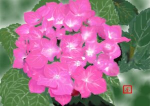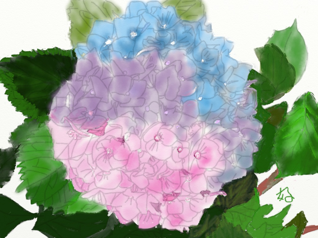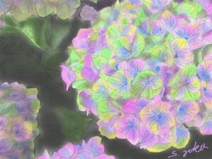 今回はその紫陽花を描きました。ピンク・ブルー・紫・白・赤と色とりどりの紫陽花は描きこたえがある素材でその特徴を活かした生徒作品をご覧ください(画像に上でクリックして大きな画像で是非!!。)