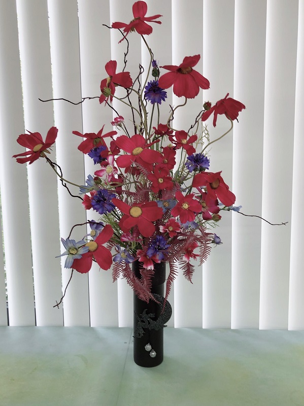 シックで優雅なこのフラワーアレンジメントは水彩クラスの熊谷好子さんの作品です。