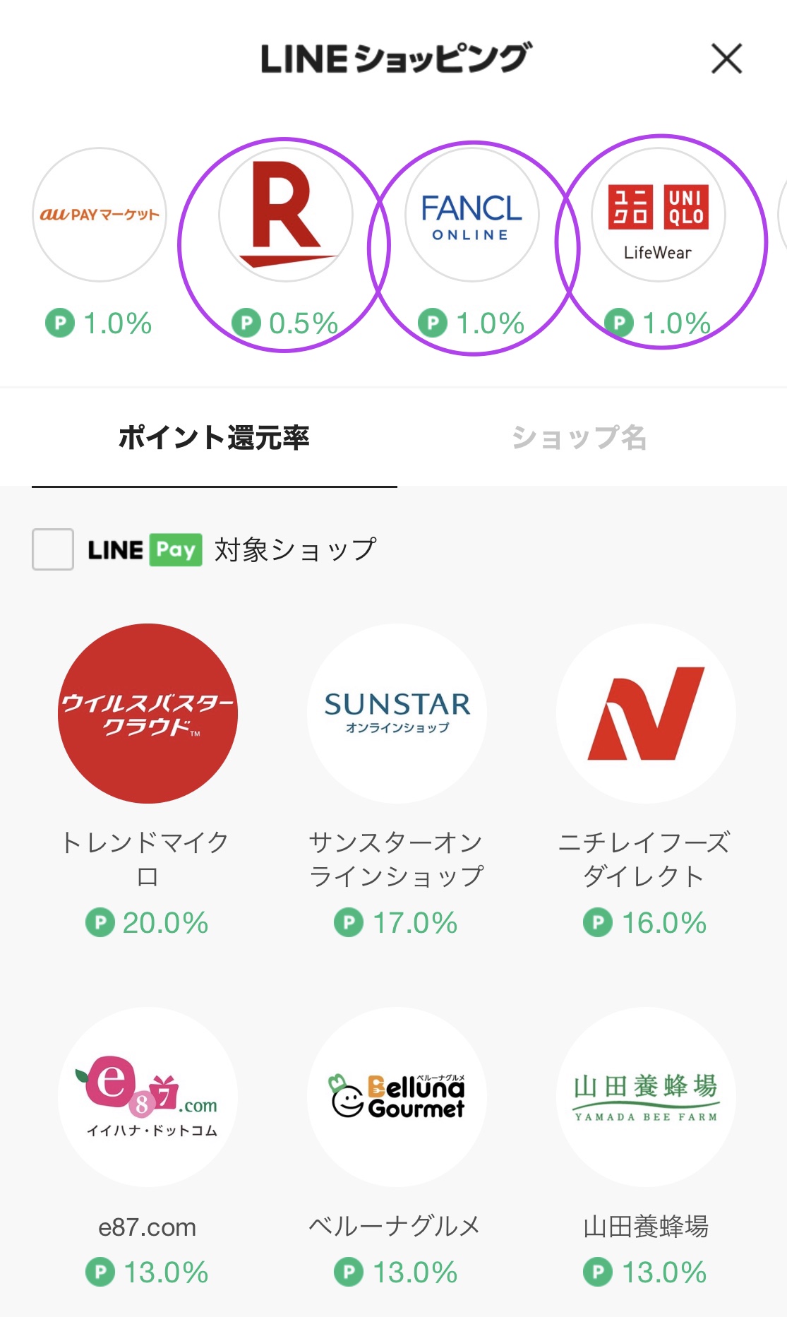 楽天市場やユニクロオンラインストアのサイトやアプリから直接購入するケースが多いと思いますが、お目当ての商品を決めた後LINEショッピングからそのサイトへ入ってお買い物をすると(ポイントサイトを経由してポイントを稼ぐことを「ポイ活」と言うそうです)お店によってポイント還元率は異なりますが、数日後(忘れたころ)にLINEポイントを付与されます。