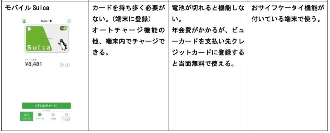 現時点で、一番お得で便利なSuica利用法はビックカメラSuicaを利用してオートチャージ設定し、おサイフケータイ機能付き端末をお持ちの場合はモバイルSuicaを作成してそちらもオートチャージ設定してSuica 2種類を使い分けることでしょうか。