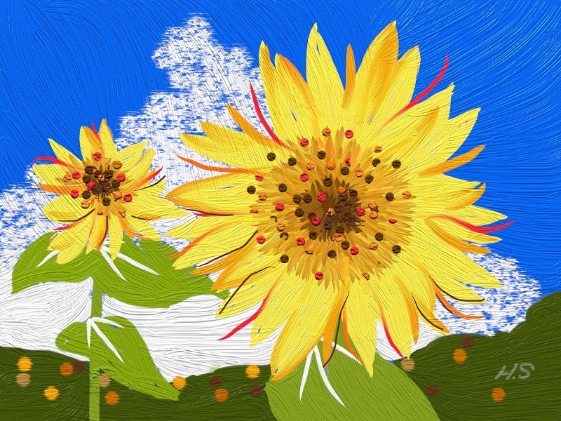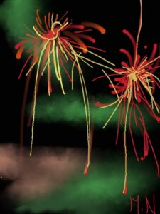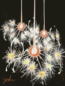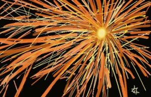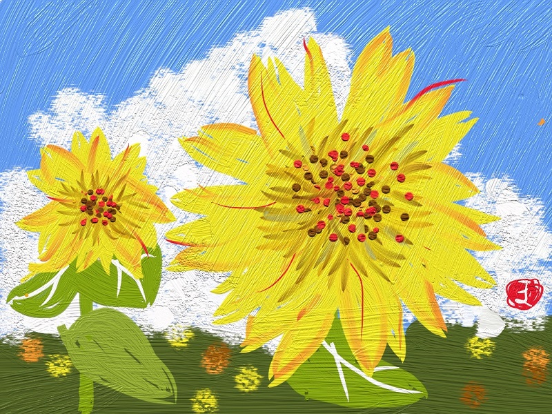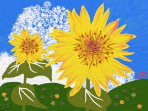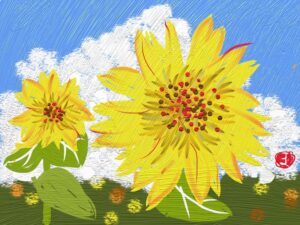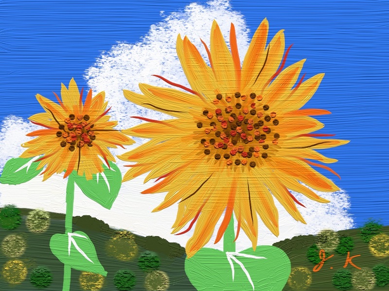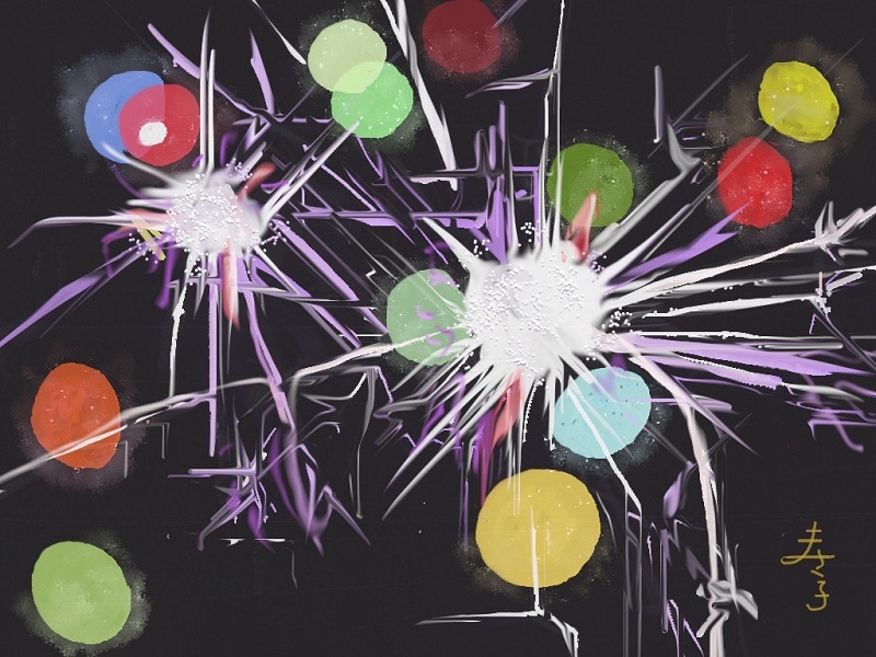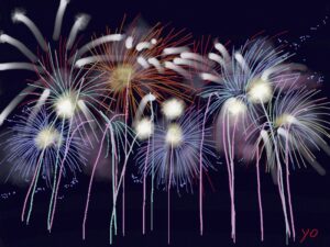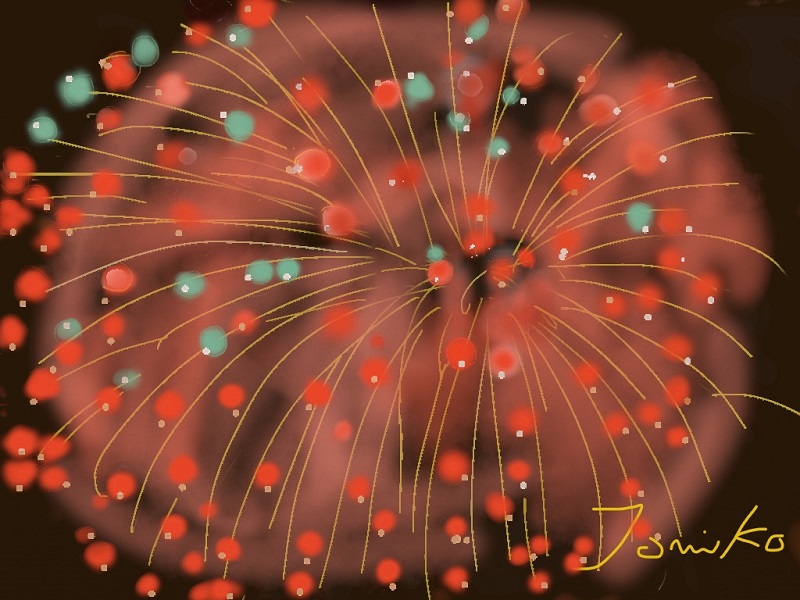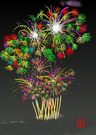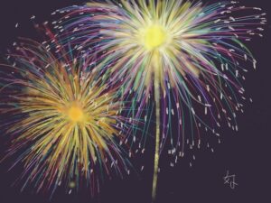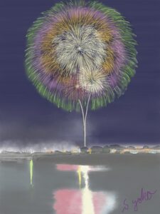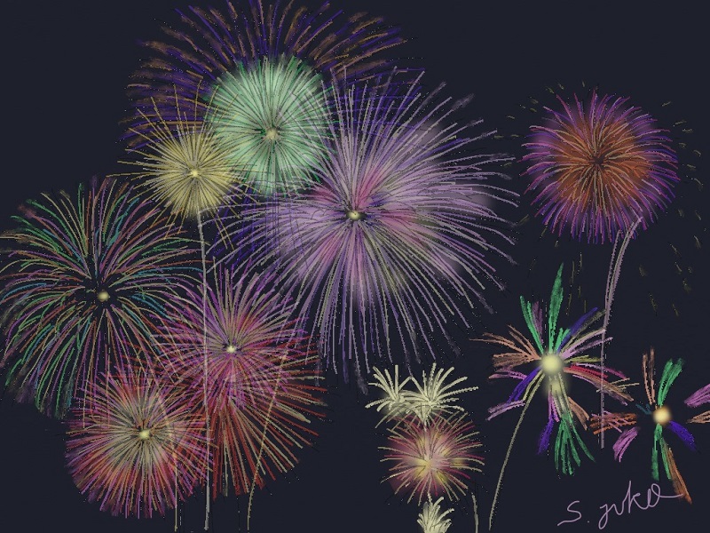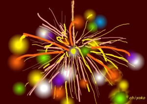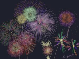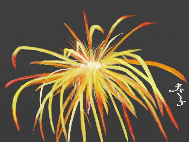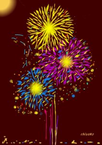今月は夏にふさわしく「花火」です。また初級クラスは油筆を使ってこれまた夏の花「ひまわり」を描きました。