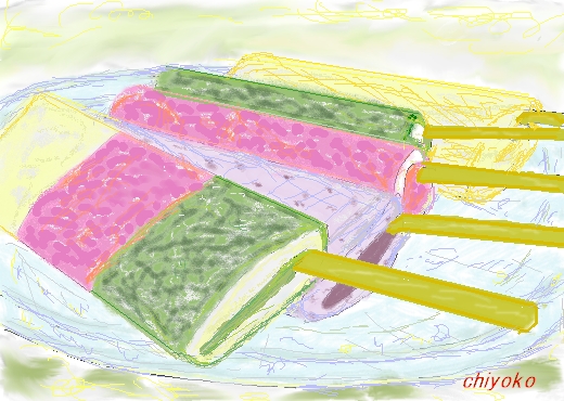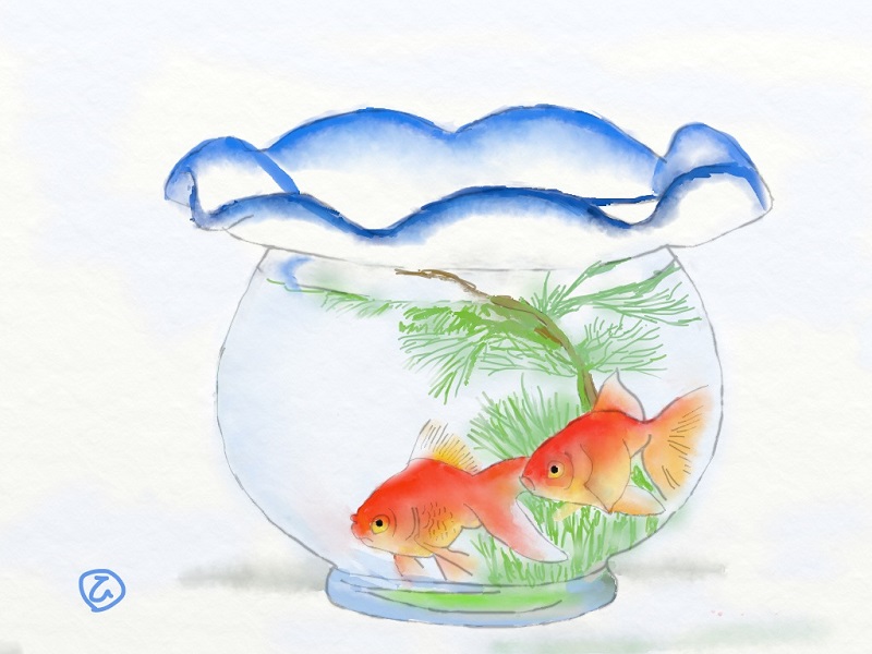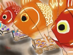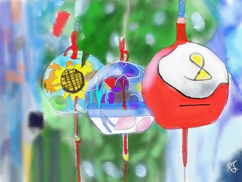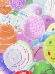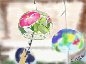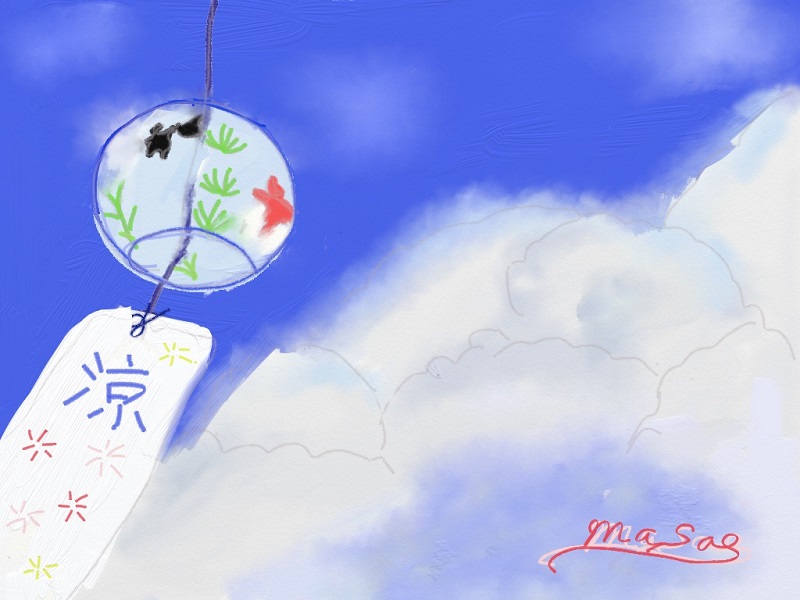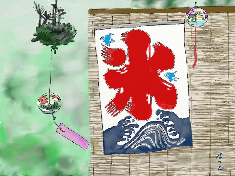 全日猛暑が続いていますがとうとう夏本番の8月になりました。今回の作品は風鈴・かき氷・ヨーヨー・金魚鉢などなどと夏バージョンを描きました。この暑い真夏を少しは涼しく感じていただけたら幸いです。