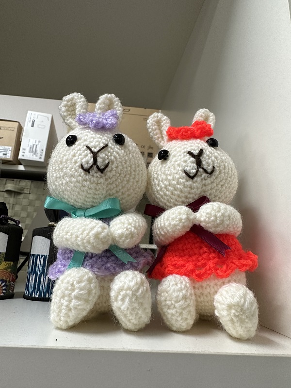 戸塚教室の棚の上に来年の干支のうさちゃんペアーがちょこんと座っていました。