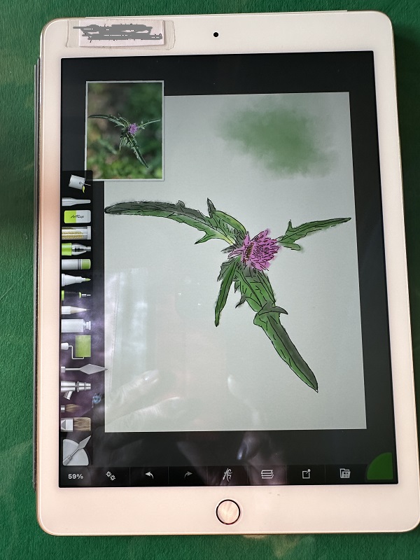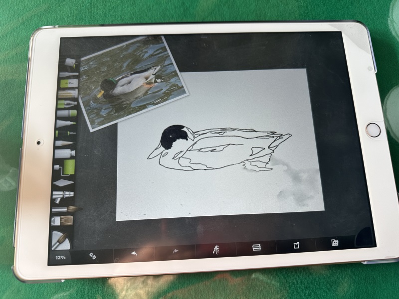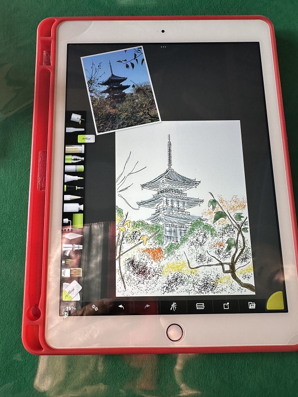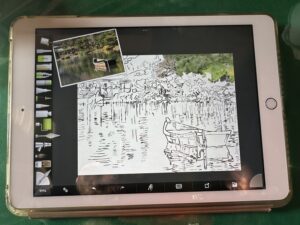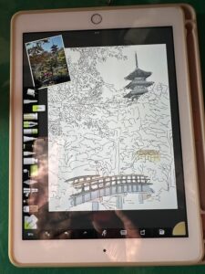 【iPadを持ってお外に飛び出しスケッチしてみませんか!ベンチでスケッチしてカフェで色付けを楽しみましょう。スケッチと言ってもまずは構図を決めてiPadで写真を撮ります。その写真をお道具の鉛筆でなぞっていきます。それをトレースと言いこれで下絵を作ります。なので絵心のない方でも安心して描けるわけです。】