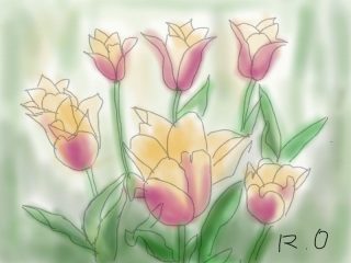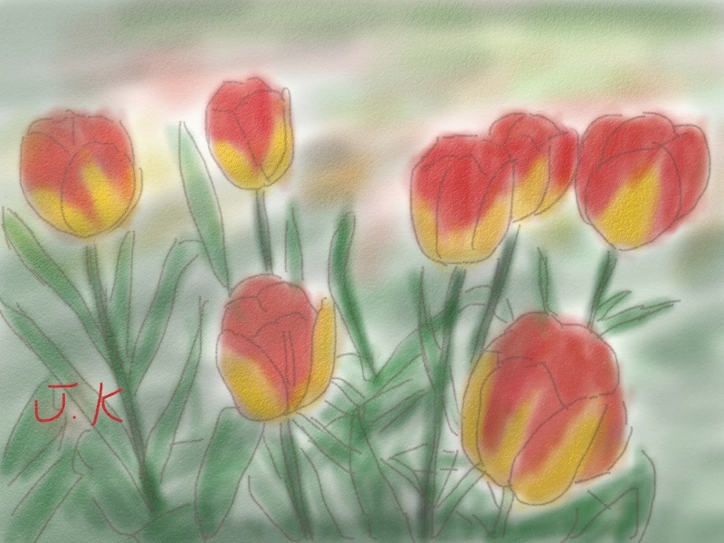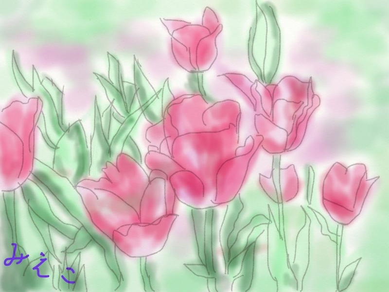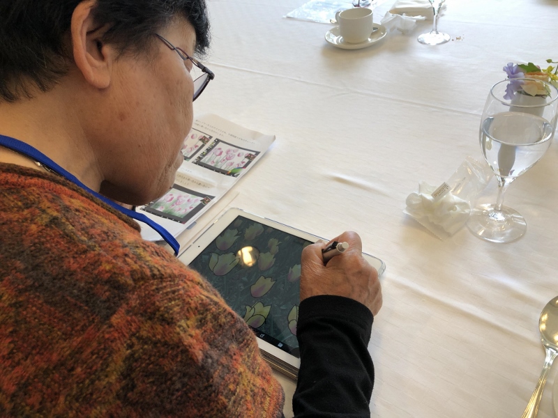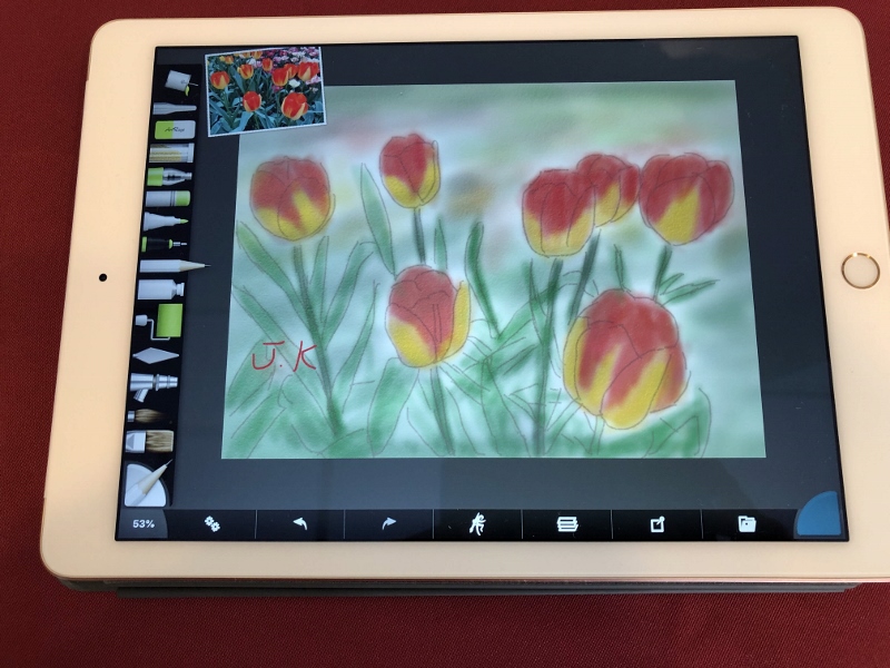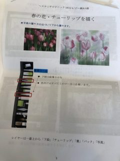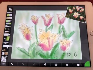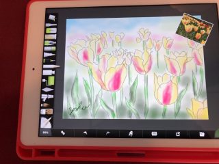 さてーいつものようにランチ後は色付けをもくもくと作業です。今回のチューリップはお道具はひとつ(エアブラシ)のみで色合いを出しました。