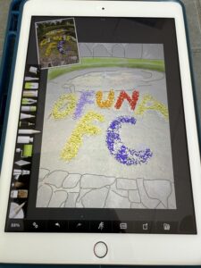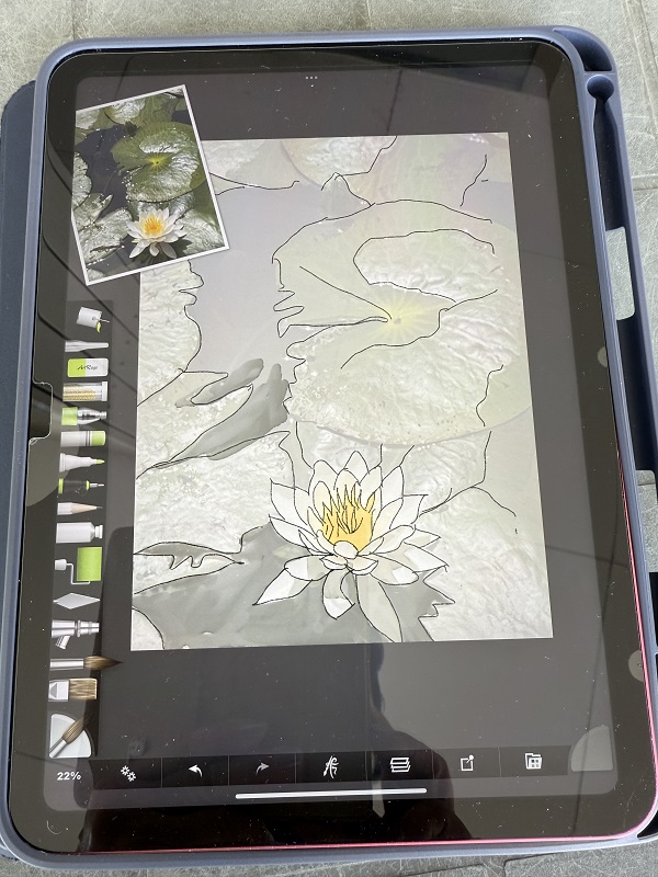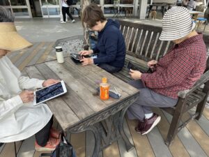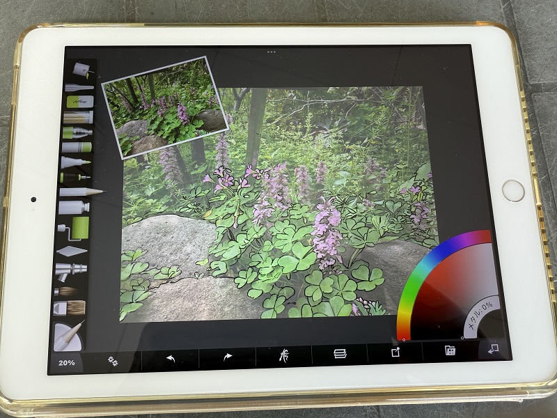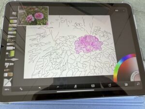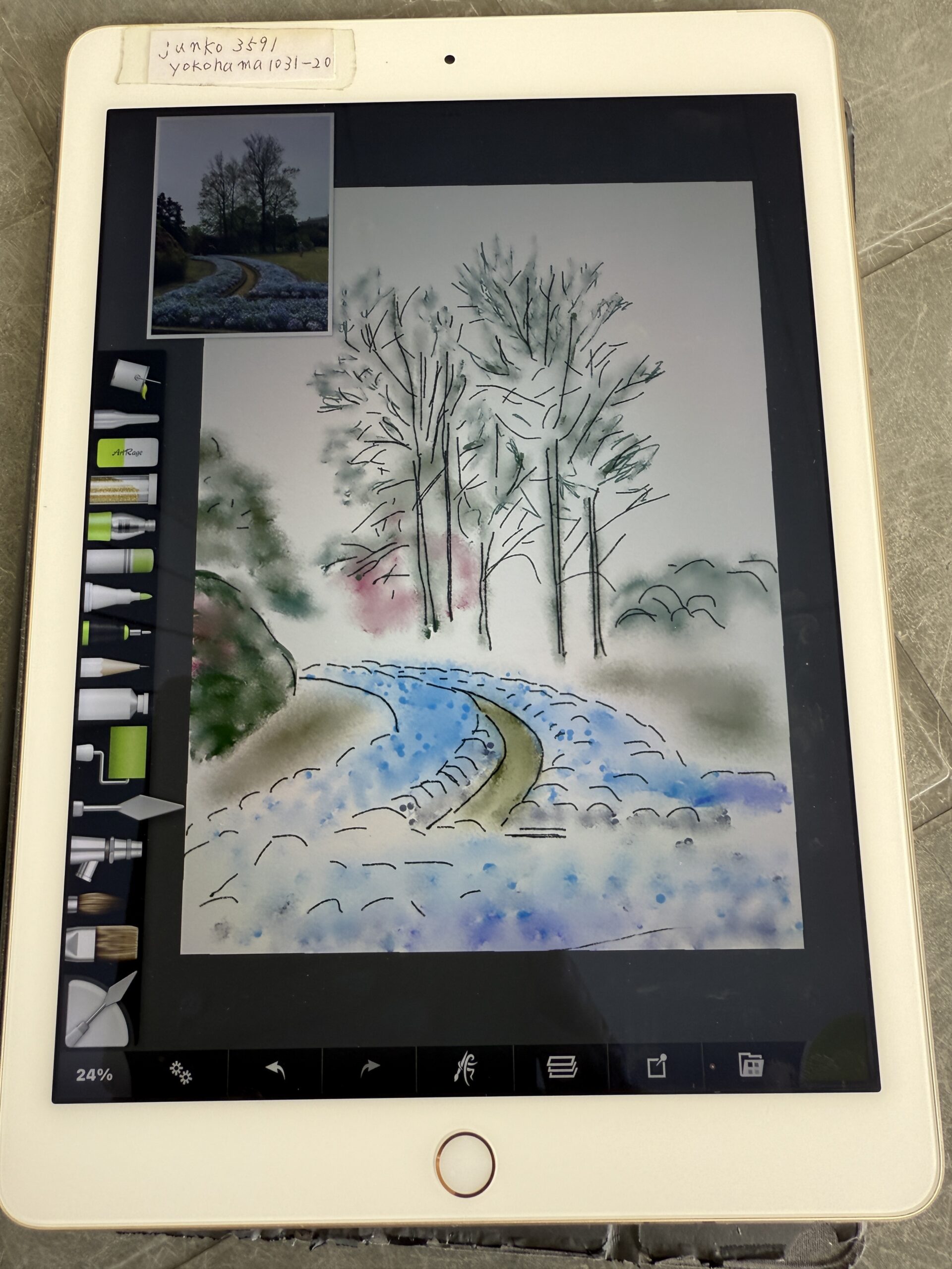 【iPadを持ってお外に飛び出しスケッチしてみませんか!ベンチでスケッチしてカフェで色付けを楽しみましょう。スケッチと言ってもまずは構図を決めてiPadで写真を撮ります。その写真をお道具の鉛筆でなぞっていきます。それをトレースと言いこれで下絵を作ります。なので絵心のない方でも安心して描けるわけです。】