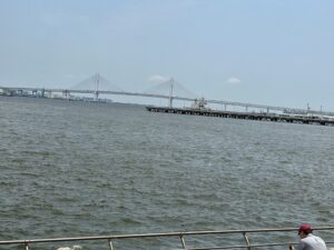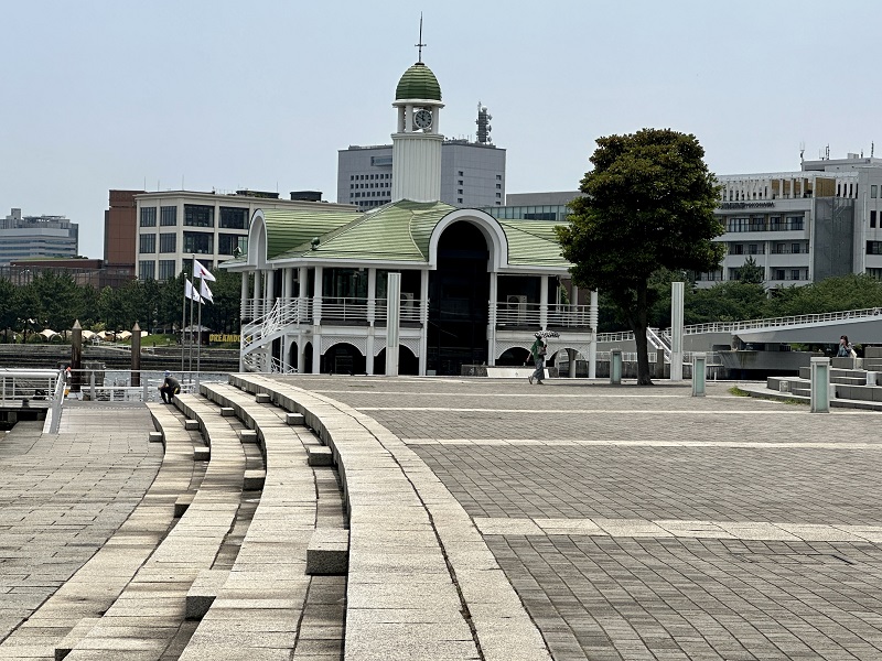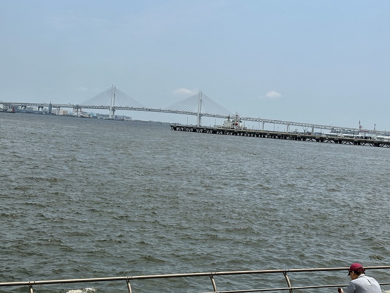 遠く横浜ベイブリッジが見え、そしてぷかり桟橋、国際展示場、コンチネンタルホテルがみえます。