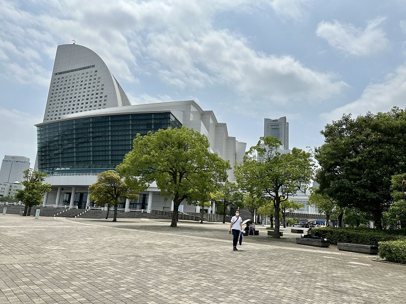 まずはみなとみらい線みなとみらい駅中央改札を抜けてエスカレーターを二つ登ります。(余談ですが最初のエスカレーターは急角度そしてな~が~い!!私にとってはもう罰ゲームのようです(笑))展示ホールへ向かい外に出て下に降りるとそこが臨海パークです。(写真の上でクリックすると大きな画像になります)
