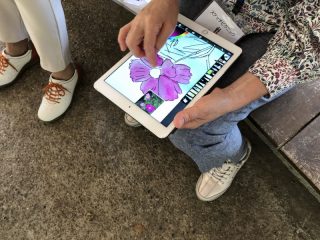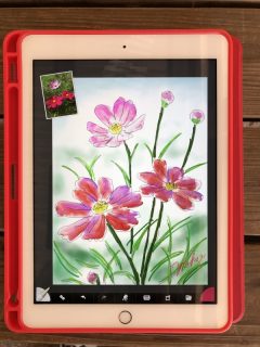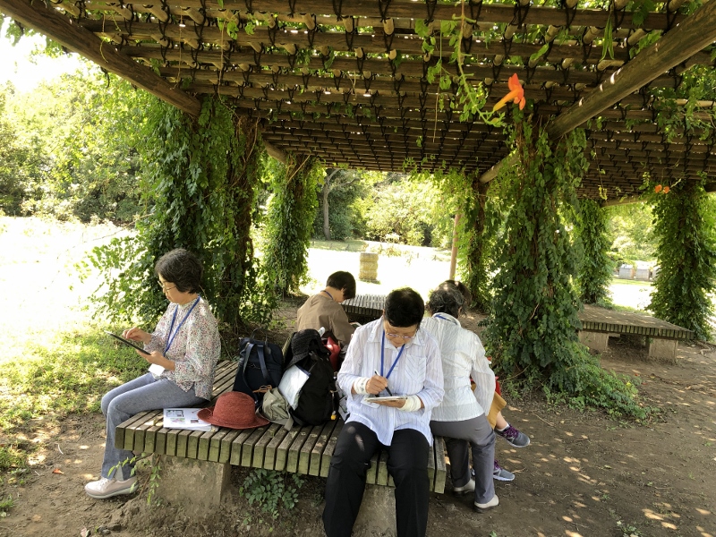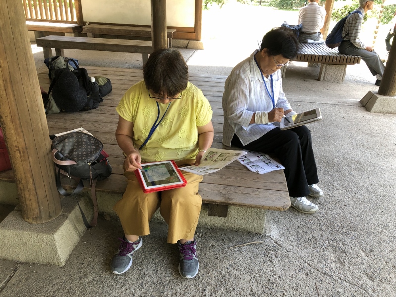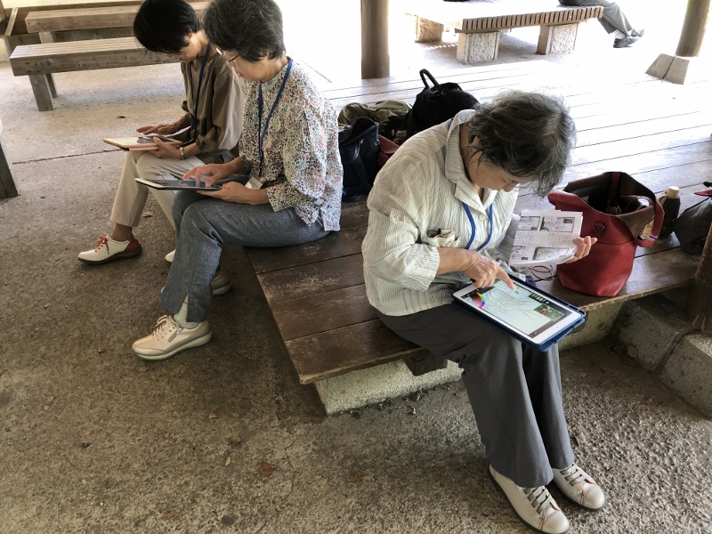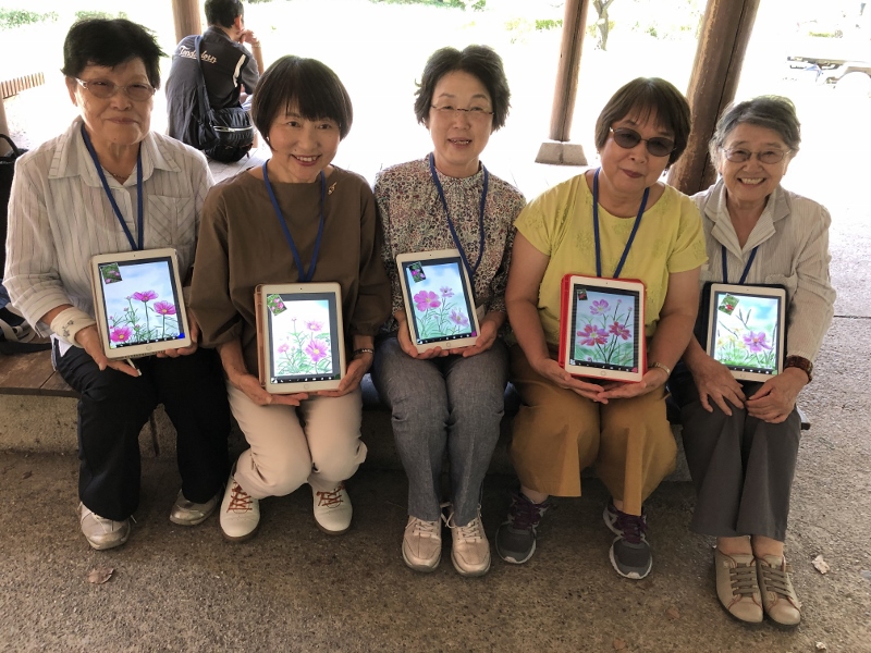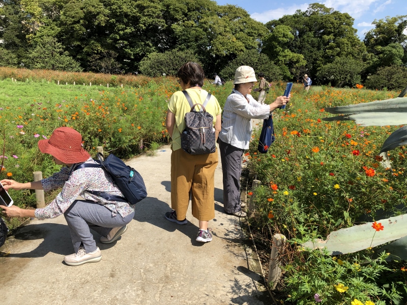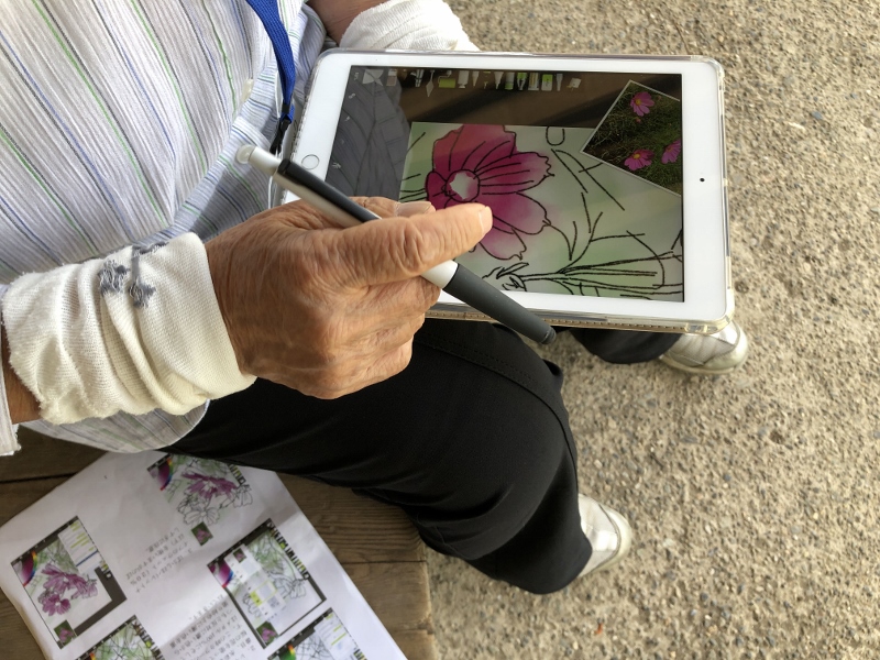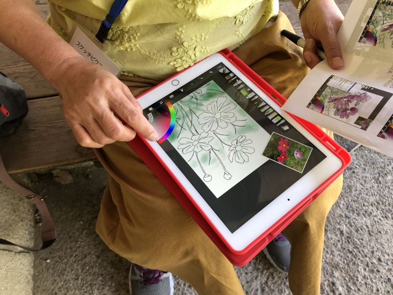 庭園内のベンチで本日の「秋桜」の描き方のレクチャーです。今回はカラーの色味を変えながら描いていきます。