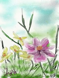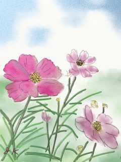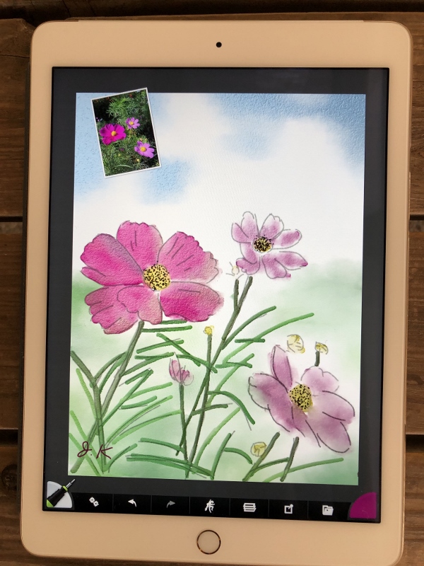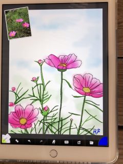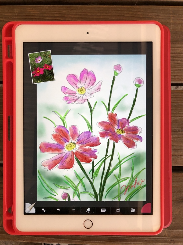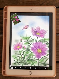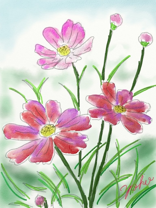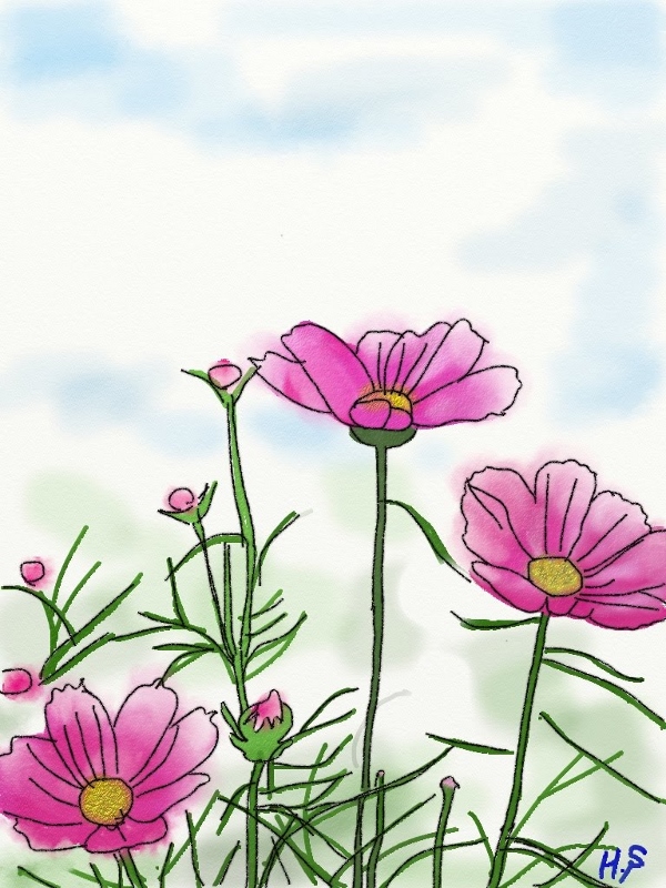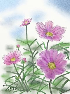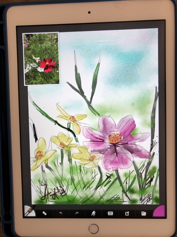 今回のテーマは「2019年の秋桜を描く」で早速コスモス畑に直行です。まだキバナコスモスが主流となっていましたが色とりどりのコスモスの写真撮影から始まりました。
