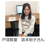 戸塚教室月曜日午前のフリーレッスンに通っていらっしゃる坂本裕子(ひろこ)さんをご紹介します。坂本さんは控えめでありながら芯のある大和撫子タイプの方です。ご本人の言葉にあるように、はじめはパソコンに苦手意識をお持ちだったそうですが、今は自分のペースでしっかりと、パソコンやスマートフォンなど使いこなしていらっしゃいます。先日もお嬢さんのお友達に卒業記念のプレゼントとして、思い出の写真入りの時計をとっても熱心に仕上げていらっしゃいました。相手のことを思って一生懸命作っている姿は思いやりにあふれていて、相手の方に伝わるといいな~と心から思いました。