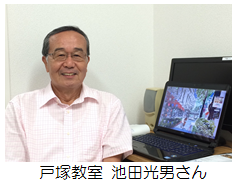 今回は、戸塚教室の池田光男さんをご紹介します。仕事から離れて、今は肩肘張らずに楽しむことを目的にパソルームに通ってくださっています。パソコンも、散歩も、絵を描くことも、楽しんでいらっしゃいます。