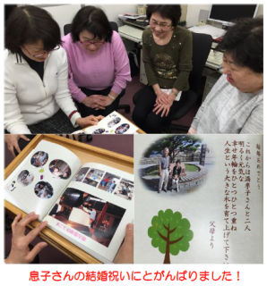 パソコンを触ったこともなく、ましてやパソコン用語など全くわからないまま入会させていただきました。初めはマウスを使う指に力が入りすぎ思うように手が動きません。本当にできるのかと不安でした。そんな状況でしたが少しずつ慣れ、年賀状作り、4月にはフォトアルバムにも挑戦しました。時間はかかりましたが立派なアルバムが出来上がり感激でした。これはもちろん明戸先生のやさしく丁寧なご指導のおかげです。