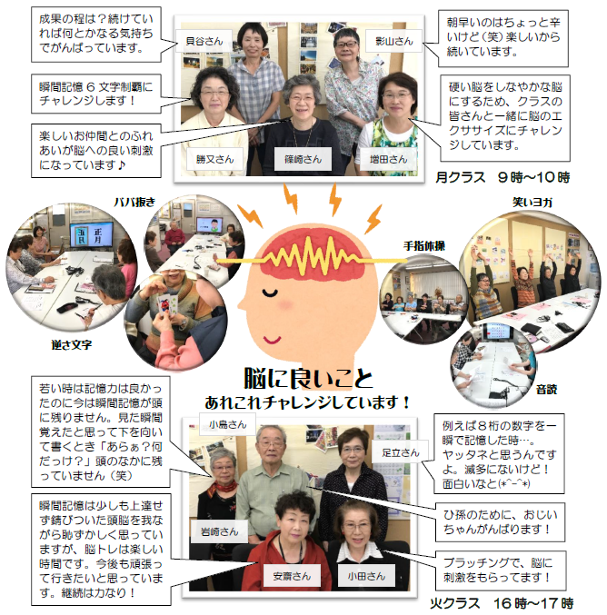 HOME > 受講生の声 > 一緒に脳のストレッチをしませんか? 一緒に脳のストレッチをしませんか? 何もしなければ老化が進むのは必然。何年経っても”今”の脳を保ち続けられるように、さらに”今”よりももっと元気な脳になるために。 とのコンセプトで、脳のストレッチ運動を行うブラッチング講座。 おかげさまで開講1周年を迎えました。今回は、弥生台教室ブラッチングクラスの皆さんと講座お様子をご紹介します。 <担任:明戸> 「あ~り~ば~ど2018年10月号・私の散歩道 より」
