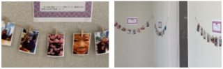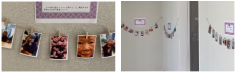老人ホームの職員は日々の介護に忙しく、イベントの準備が叶わずにいました。施設ではアイパッドを記録の端末として採用していますので、入居者の写真をたくさん撮りためていました。その中から5~6枚の写真を印刷し、可愛くクリップでとめてコメントを付けて展示しました。これも大変好評でした。