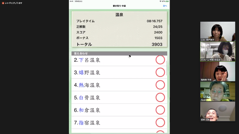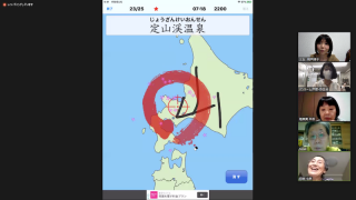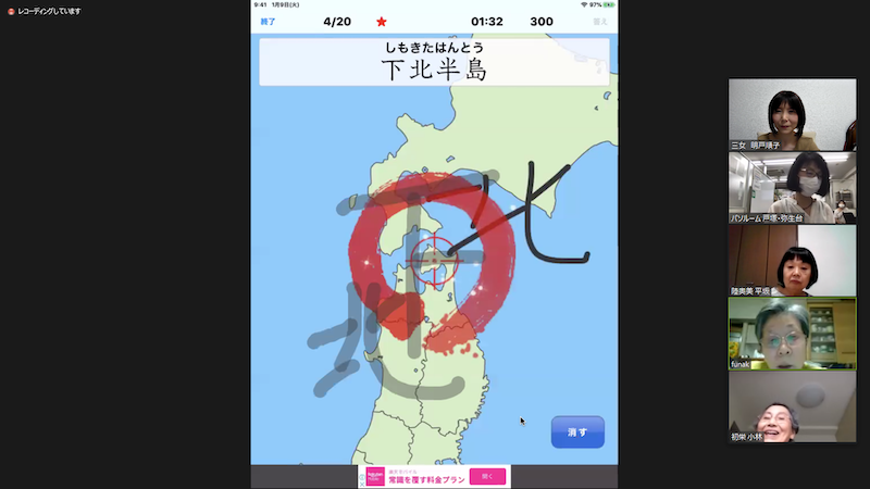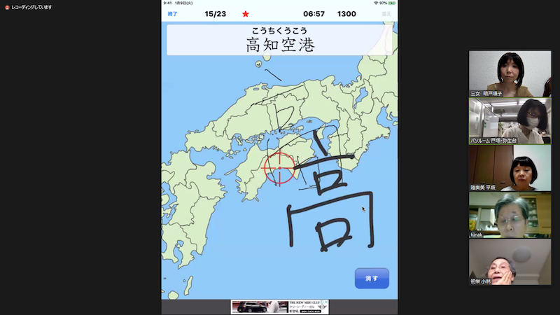 こちらは、日本地図から出題される全国の地名、県名、山、湖などの名前を手書きで答える「書き取り」ゲームです。皆さんと一緒に知恵を出し合って問題にチャレンジしました。