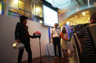 各テーブルを回って見せてくれるマジックはみんな少しずつ違うようで、追いかけてすべて見たい気分でした。マジシャンの手にかかって、トランプやコインが現れる体験をした方達の驚き顔もなかなかでしたね。目の前で繰り広げられるマジックのおかげで会場はすっかりにぎやかになりました。
