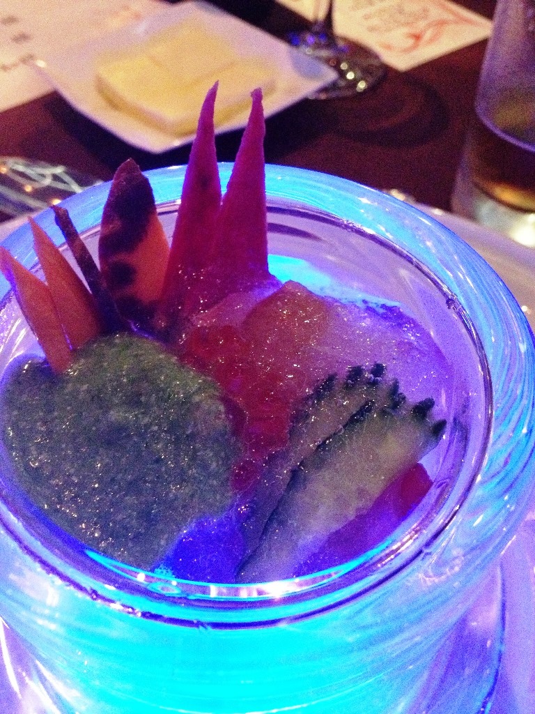 乾杯に引き続き、スタッフによる参加者の皆様のご紹介、そしてスタッフの自己紹介。その間も、きれいな前菜が出てきて、あちこちでカメラのシャッターを切る音が・・・(笑)やはり皆様、写真はお好きですね。