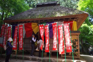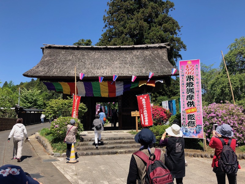 山門をくぐって境内に入り、護摩堂前で記念撮影。