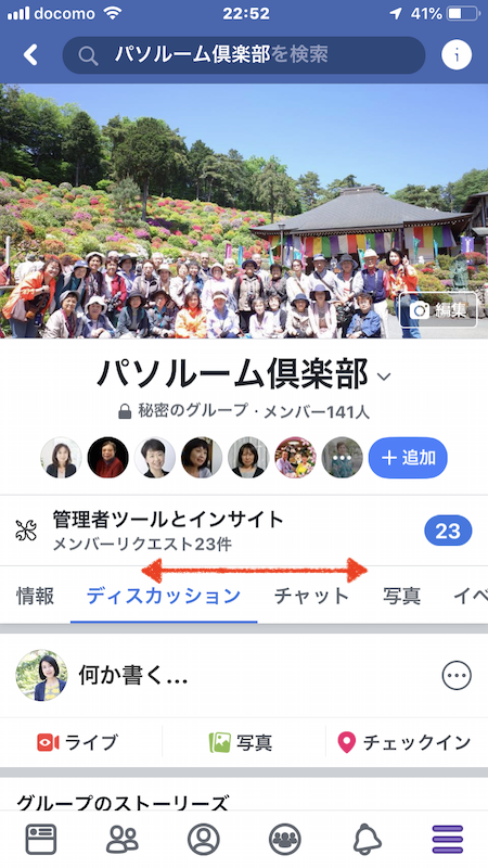 ●FBのグループ「パソルーム倶楽部」を表示して、「情報 ディスカッション チャット」のところを左右にドラックします。